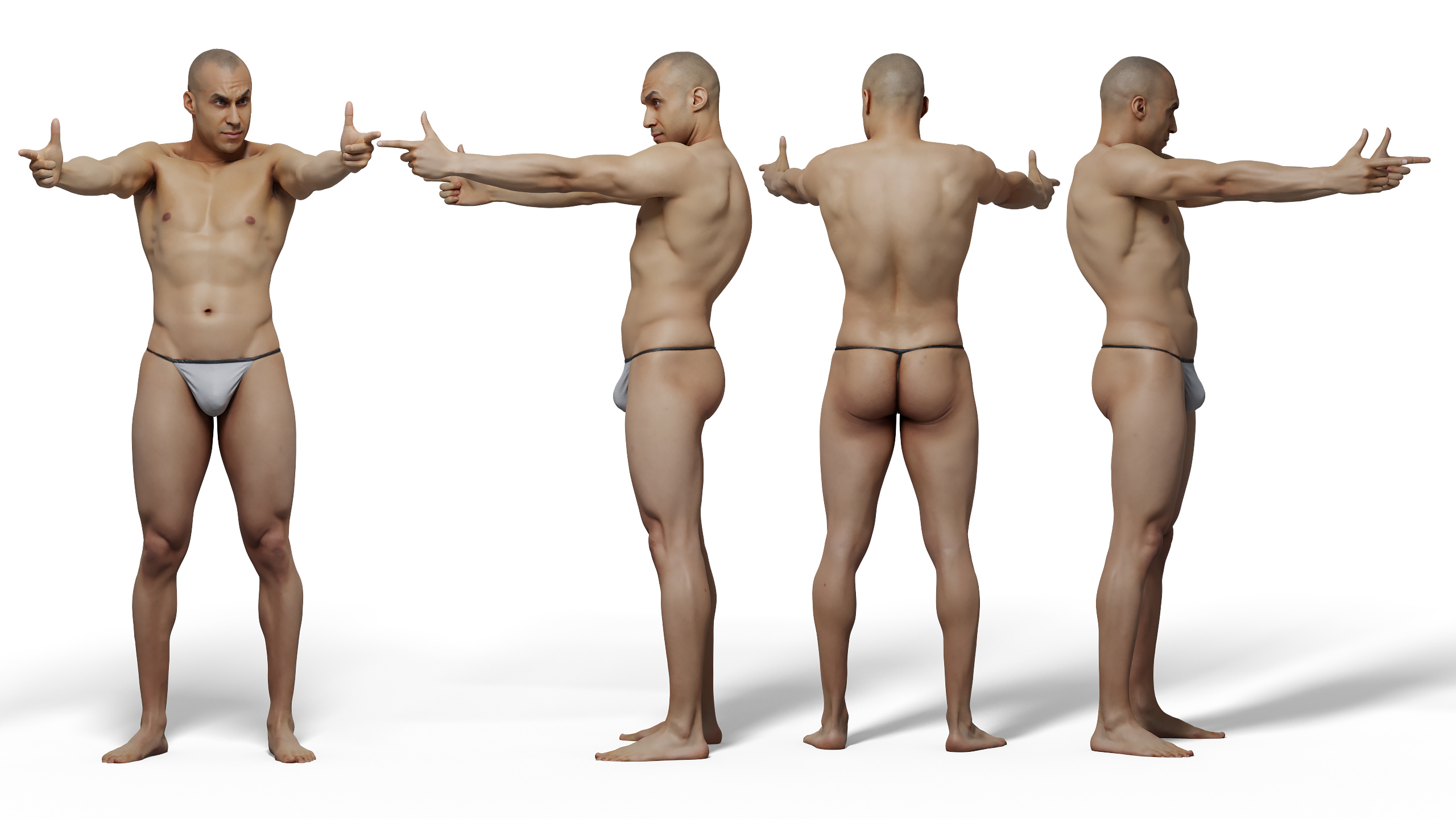 This male anatomy reference model is perfect for studying anatomical or for using as a basis for your own unique character. Our reference poses are produced using a combination of RAW scan data projection and automatic topology generation using Zremesher. Each model comes with a 5 subdivision ZTL model with between 7.5 and 8 million polygons at the highest level. We have also supplied a 750K decimated OBJ file with mlt and 8k JPG texture map. These models do not contain animation ready topology but are suitable for sculpting and basic rigging and movement.