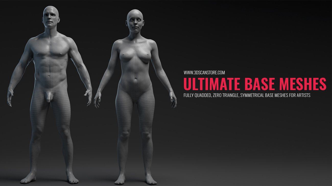 We are extremely happy to announce the release of our updated male and female base meshes. These represent a significant upgrade from the previous models available on the store and feature a fully quadded mesh with no triangles, perfect for sculpting, wrapping and rendering. Both male and female meshes are available either individually or as a bundle both with A and T poses in OBJ, FBX and ZTL format. Zbrush files include a 5 subdivision mesh with posable symmetry.
