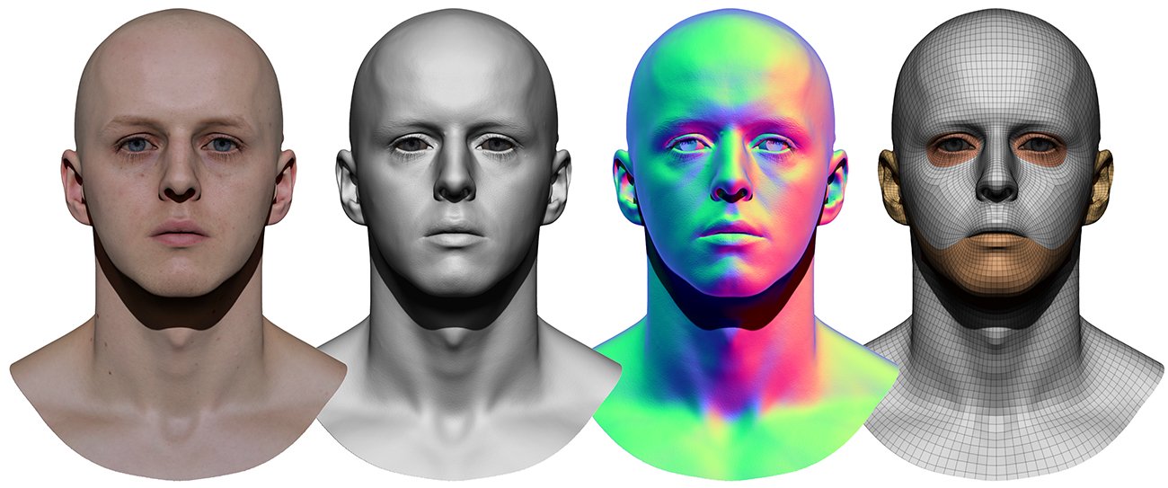 All Retopologised head 3D head models share the same point order and UV maps which allows swapping of textures and geometry morphing