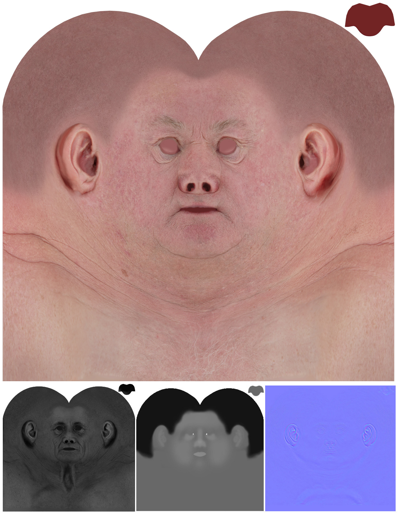 A fully symmetrical, retopologised older male 3D model has been captured using our high resolution scan system. This cleaned scan data comes with all visible internal head components.  Eyes, corneas, teeth and eyelashes. Robust 16k textures in both PSD and JPG format. Realtime resolution ready with 8k normal maps extracted from the included 6 subdivision ZTL source model. Also includes a Marmoset Toolbag scene file with accompanying specular, gloss and translucency maps.