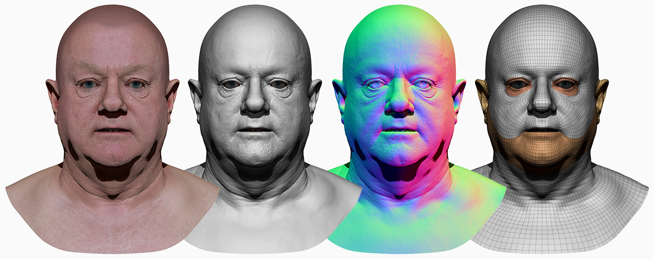 All Retopologised head 3D head models share the same point order and UV maps which allows swapping of textures and geometry morphing
